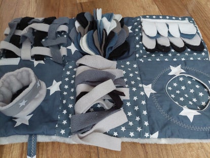Snuffelkleed/snuffelmat. Prijs afhankelijk van aantal en grootte van de panelen. Met meerdere mogelijkheden om brokjes te verstoppen in verschillende moeilijkheidsgraden. Geschikt voor alle dieren die gericht zijn op eten en een uitdaging aan kunnen, zoals bijvoorbeeld honden, katten, fretten, konijnen.