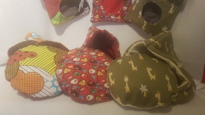 Het kleinste formaat slaapmuts. Binnen en buitenzijde van fleece of sweatstof en voorzien van een los kussentje. Samen met een klein hangmatje met vier ophanglussen.